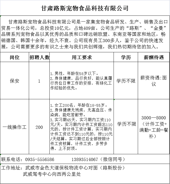 甘肃路斯宠物食品科技有限公司,招聘保安一名,一线操作工200名,学历不限,地址:武威驾考中心向西两公里处 ,联系电话:13893514067(微信同号)