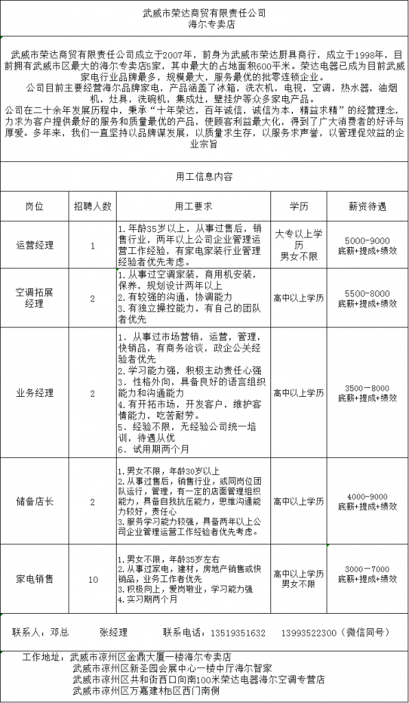 武威市荣达商贸有限责任公司,招聘运营经理1名,空调拓展经理2名,业务经理2名,储备店长2名,家电销售10名,地址,城区各大经销店,电话:13519351632