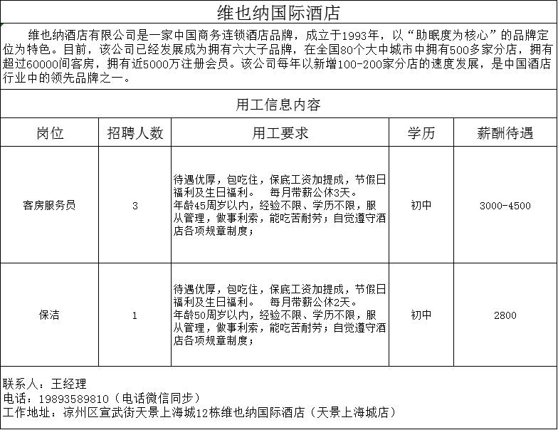 武威维也纳国际酒店,招聘客房服务员名,保洁1人,详情看图,联系人:王经理,电话:19893589810(电话微信同步)