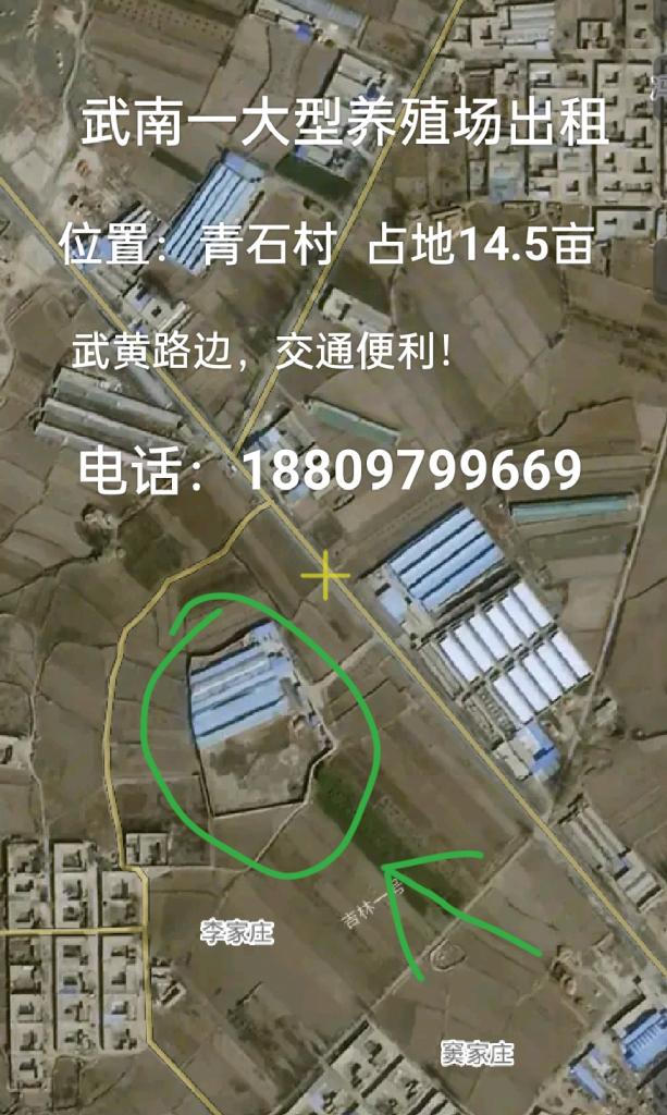 武南养殖场对外招租,位于青石村,占地14.5亩,临近武黄路,已建养殖棚面积2000平方米,住宿房屋、伙房等一应俱全。联系电话:18809799669