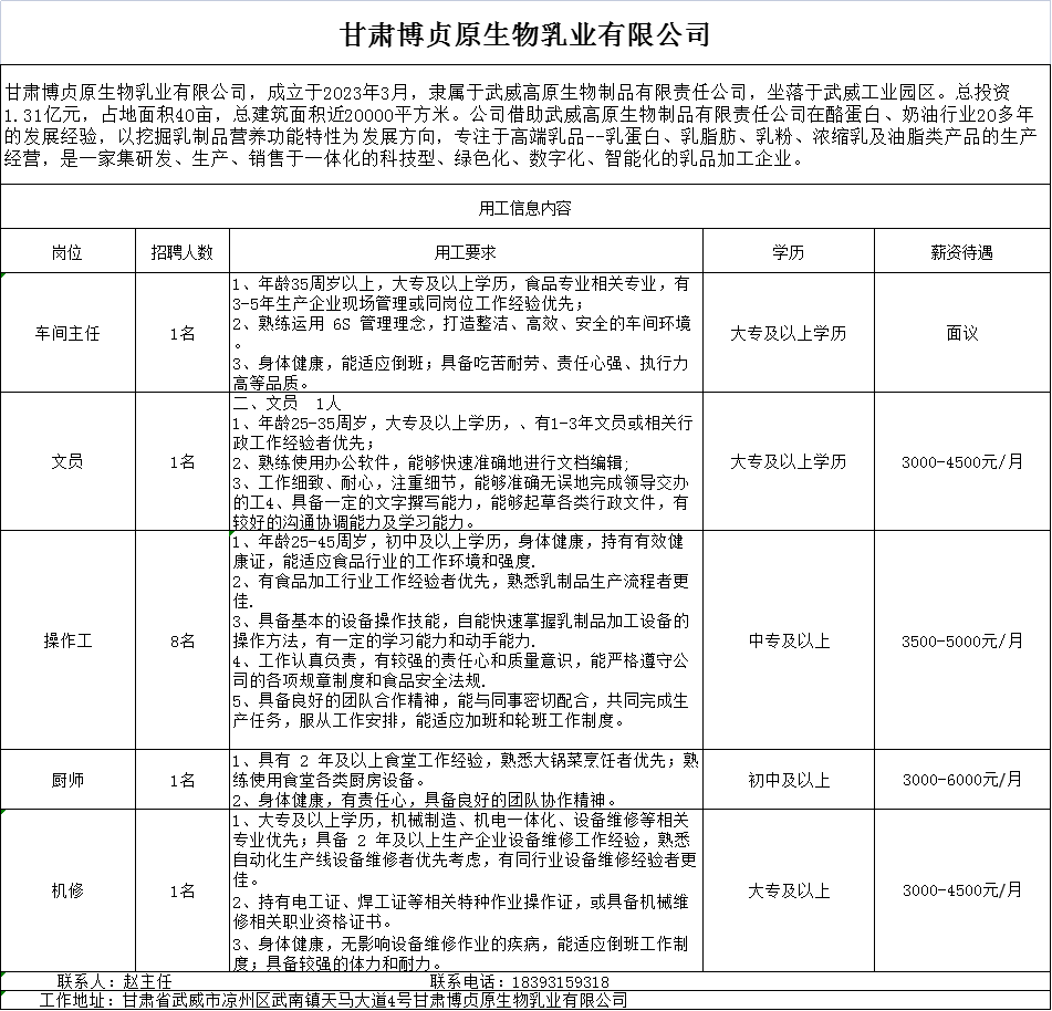 甘肃博贞原生物乳业有限公司是一家集研发、生产、销售于一体化的科技型、绿色化、数字化、智能化的乳品加工企业。招聘车间主任1名,文员1名,操作工8名,厨师1名,机修 1名具体情况电话咨询,联系人:赵主任(电话:18393159318),地址:武南镇天马大道4号甘肃博贞原生物乳业有限公司