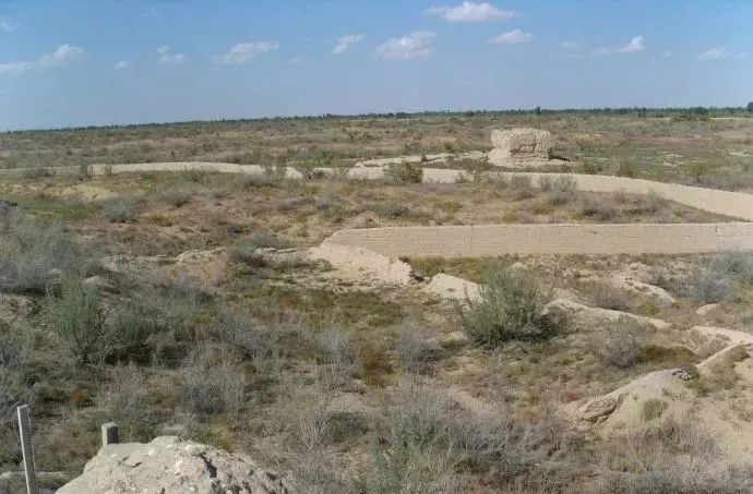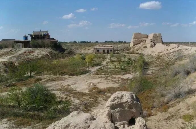 察看整个城垣遗址,略呈长方形,东西长约200余米,南北则稍窄。四周城址轮廓均宛然可辨,北面、东北方向墙垣保存较好,东北部的一处角墩尤其完好,远望高大巍峨,气势尚威。爬到上面去瞭望,则见城郭东、南、西面都是成片的农田、房舍;北面可见沙海连绵,柴草稀疏。让人惊异的是,城垛之上还有不知何人何时所搭建的简易棚舍,虽草木枯朽,倾塌已久,但架构仍在。
