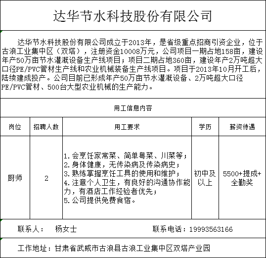 达华节水科技股份有限公司,位于古浪县古浪工业集中区双塔产业园,现招聘厨师2名,薪资:5500+提成+全勤奖,详情看图片介绍。联系人:杨女士